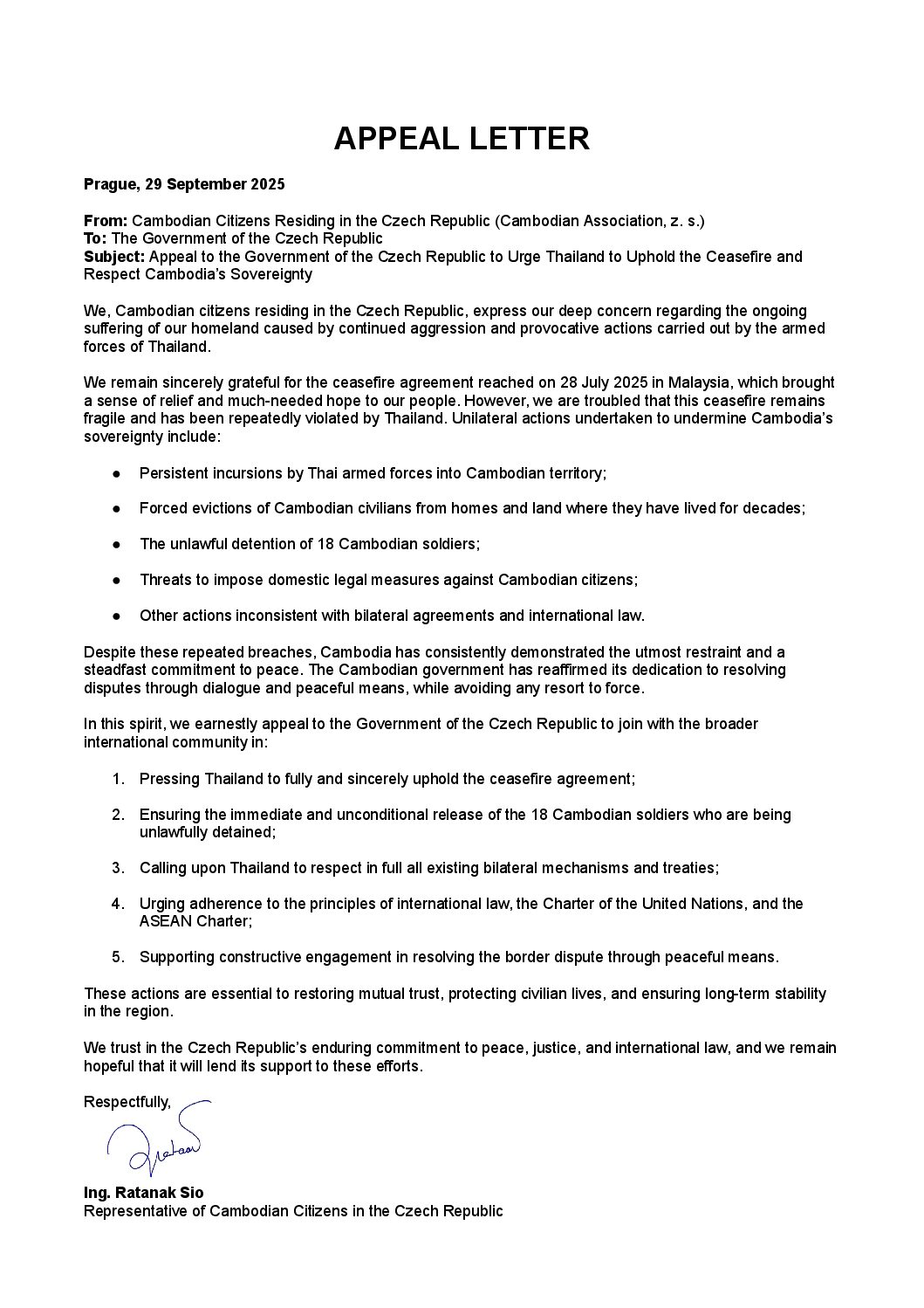 We, Cambodian citizens residing in the Czech Republic, express our deep concern regarding the ongoing suffering of our homeland caused by the continued aggression and provocative actions carried out by the armed forces of Thailand.